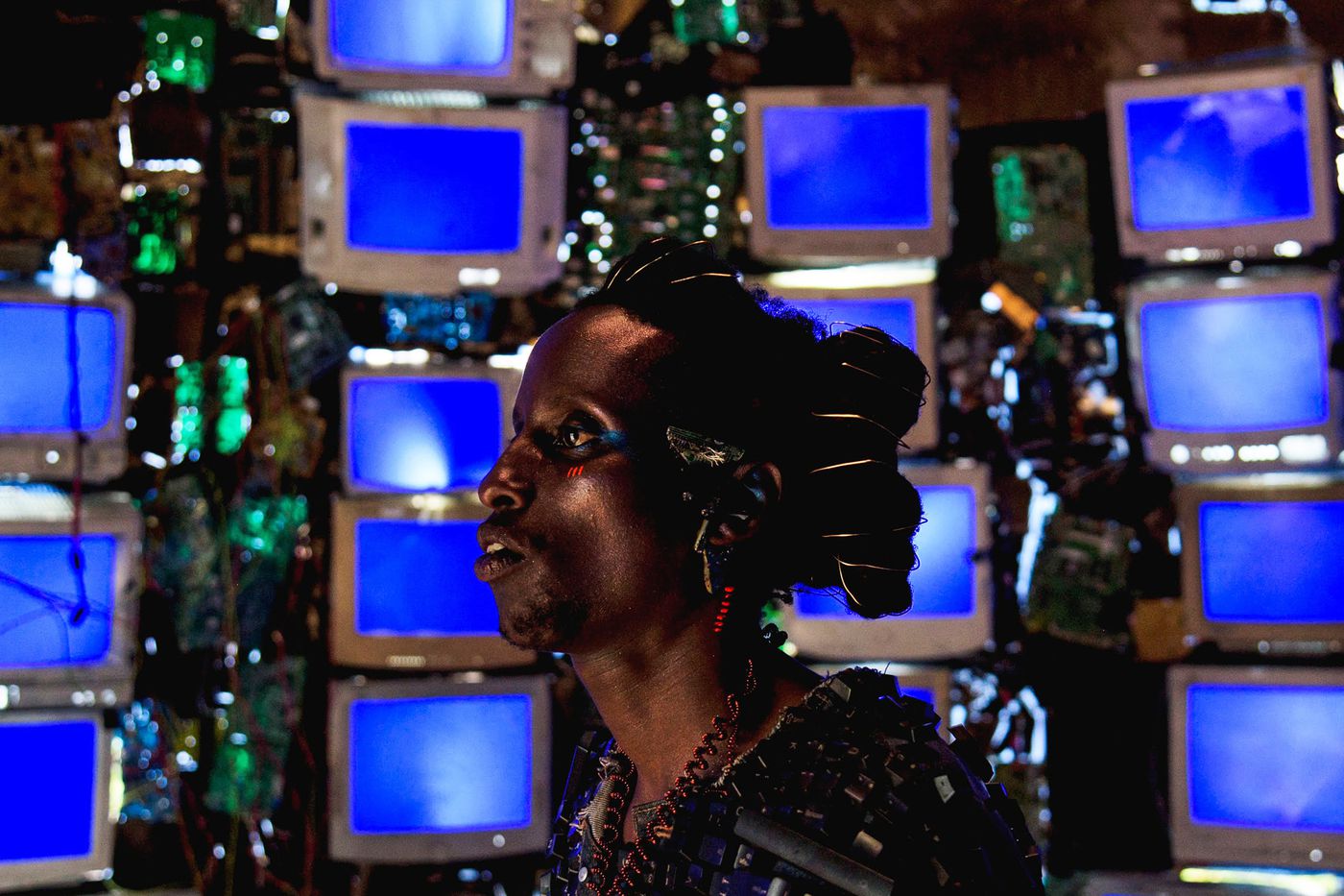 Neptune’s instinct is to run away. Eventually, the character ends up at a kind of commune—a rural hacker collective that suggests an art installation. Consisting of discarded electronics (particularly desktop monitors), the place—dubbed Digitaria—is a commentary on Africa-as-dumping-ground. But it also underscores the continent’s resource-rich status. Coltan, which one character describes as “the power in the earth,” is essential to the production of those devices that the hackers skillfully repurpose. Yet many of the hackers are themselves made up of electronics. One woman, a victim of marauding soldiers, has a prosthetic arm that serves as a sort of computer; others clad themselves in blankets decorated with PC keyboards. (The remarkable costumes are by Cedric Mizero.) This posthuman landscape is also, ostensibly, a postwar one. There is much talk of a past conflict, but also the sense that organized violence persists. Armed soldiers patrol the countryside, yet the tech-heavy commune is, by design, anti-patriarchal. (According to Memory, brilliantly played by the remarkable Eliane Umuhire, the soldiers took up arms “because they were born boys. They are priests at their own funeral.”) Before the war, women hid indoors; now, they sleep outside, where they also ply their technologically sophisticated trade.