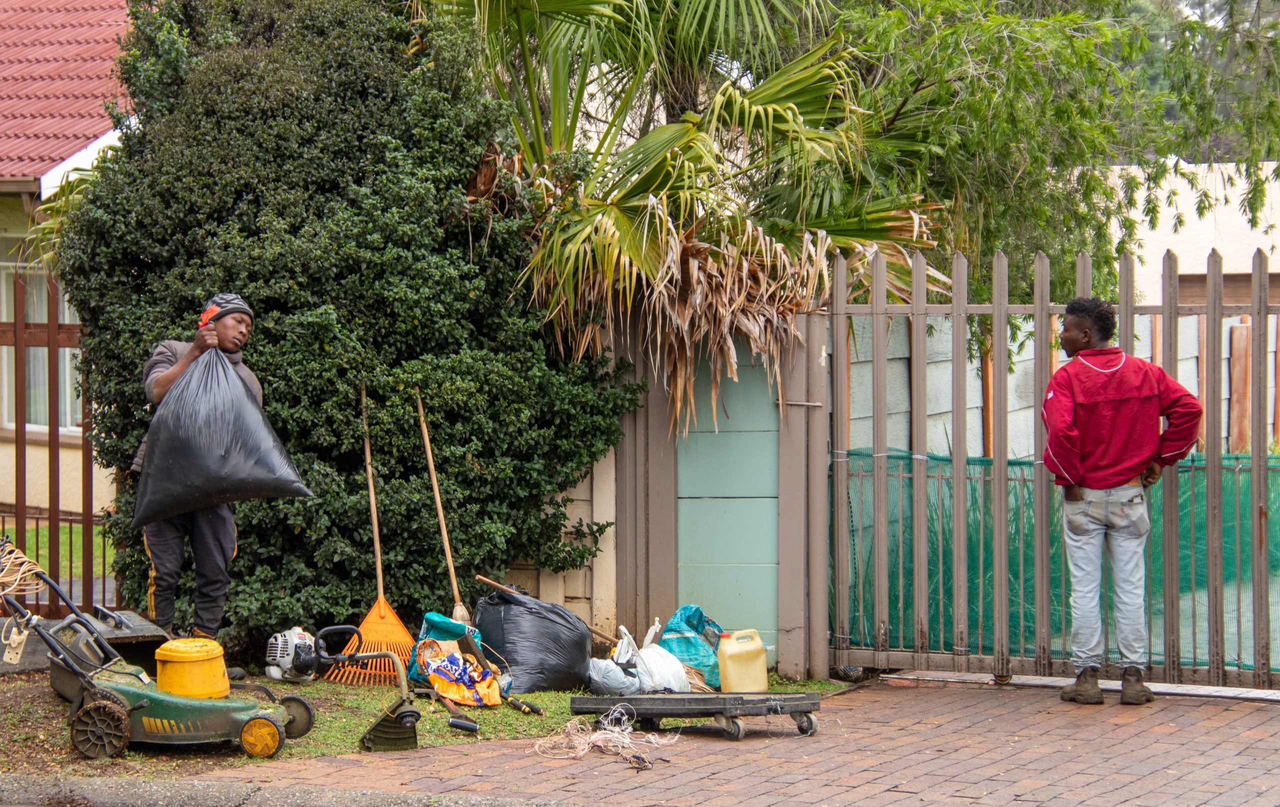 Young men offer a mobile garden cleaning service to residents in the suburbs of Johannesburg, April 2025. © Richard van der Spuy / Shutterstock.com