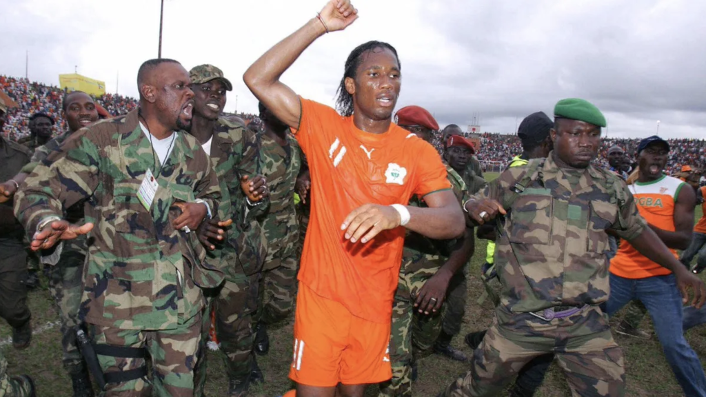 In 2005, amid the Ivorian civil war, the Elephants beat Sudan 3-1 to qualify for the nation’s first-ever World Cup. After the match, in the dressing room, captain Didier Drogba called all the Ivorian media stations present at the match in Omdurman to broadcast a message of peace in which he called for the rebels to lay down their arms and end the war.