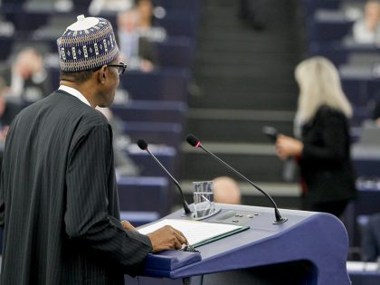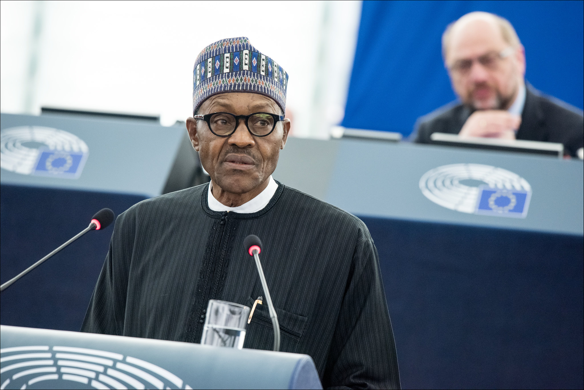 Nigeria 's president Muhammadu Buhari delivering a speech to the European Parliament in Strasbourg. Credit the European Union 2016-European Parliament CC BY-NC-ND 4.0.