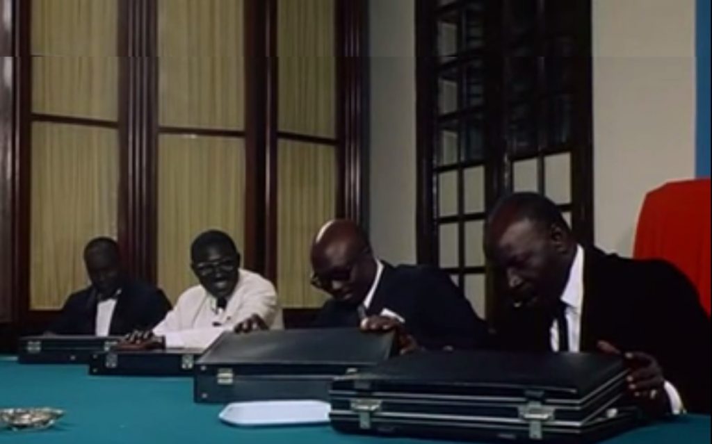 “Xala” (1974) is a powerful political narrative. At times edging toward the surreal, at others an acute depiction of the complexity of the freshly independent Senegal, the film has become famous for its striking comment on the impotence of the new political bourgeoisie. In the use of repetitive visual symbols, Sembène creates a wicked juxtaposition of the traditional and the modern in Senegal. The briefcase – the garb of business and efficiency, takes on a surreal, almost voodoo status. Sembène drives it to a comic extreme; French officials banished from the Chamber of Commerce carry nearly four each, their hands straining to hold onto the mass of shiny black nothingness, while members of the newly instated Senegalese cabinet sit in their new chamber, smiling with glee at cases farcically stuffed with cash.