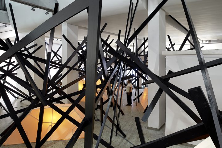 Structural Response V is the latest iteration of Nitegeka’s iconic large scale all-black wooden plank installations that have been widely exhibited in South Africa and overseas. In these installations, visitors are immersed and made to feel small in relation to the scale of the beams that cross above and around them at sharp angles. There is a sense of danger for those who visit the installation. Movement is difficult, but not impossible, echoing the hurdles migrants have to go through as they move from country to country. At WAM, the Structural Response V had a new addition in between the wooden beams: tents lit with a warm light from the inside, giving the impression of occupied spaces. The tents had been previously shown as Camp, a standalone outdoor installation at Nirox Sculpture Park (2025) and Spier Light Art Festival (2025), but never shown as part of the Structural Response. The contrast between the softness of the tents and the hostility of the beams is not only material, it is conceptual. That is, while the beams signal to the hardships of forced migration, the tents point towards a private moment of leisure and rest. These temporary shelters evoke the existence of scenes that the audience does not, cannot, access. Visitors can, however, get close enough to witness that fictional intimacy inside the tents and be part of it as observers.
