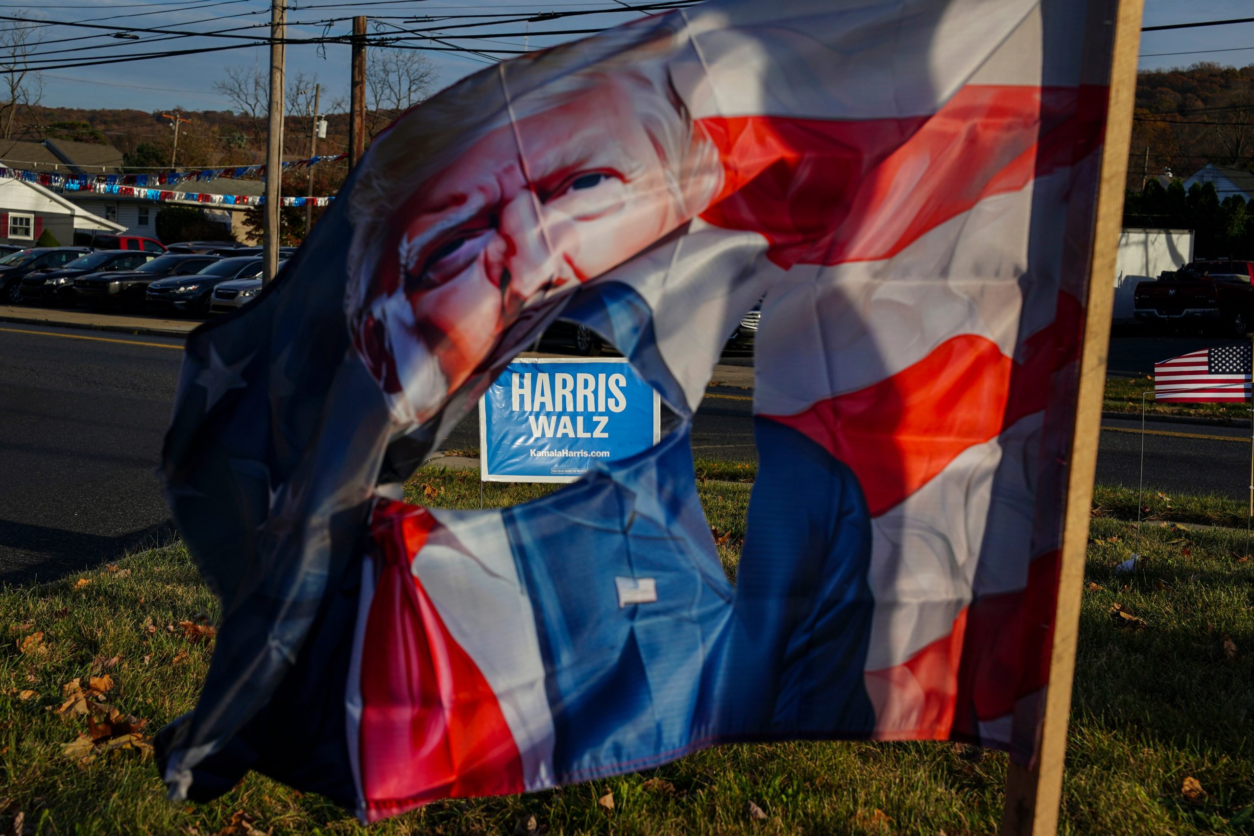 A Harris-Walz campaign sign is seen through a waving Trump flag Nov. 4, 2024 in Allentown, Pennsylvania. © Matt Smith via Shutterstock.