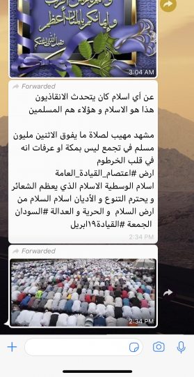 Notably, however, and parallel to the protesters’ critique of Islamists like ‘Abd al-Hay Yusuf, is an attempt to capture a role for Islam in a certain kind of resistance politics, as indicated in the kandaka poem I cited above, where (true) Islam was depicted as an inspiration to stand up against oppression, rather than solely the idiom of state oppression itself. Another related image that has been circulating a lot on social media is this one, which several of my Sudanese friends sent out over WhatsApp. It depicts a massive group of protesters praying, flanked by the words: