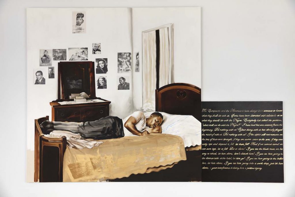 I do work mostly from photography, pretty much exclusively. Half from pictures I take and half from appropriated images. I would say it [photography] is more limiting than I found, not just for myself. But, if you look at painting in general, in the last 150 years, it is very much tied to the pictorial framework about the picture, about how photography captures space. It is something that I am trying to overcome now. I am trying to figure out how to expect space, how to think about space differently, how to think about things like the pose, setting, lighting—these things tied to the photographic context. But, I have pretty much painted with that kind of mechanism. But, it is also a way to relate to the history of representation, which, if we think of the black African subject, that subject enters the visual language of West through an ethnographic and anthropological framework. Again, that is an important part I tried to think of: What kinds of images have been reproduced and what politics do these images reproduce?