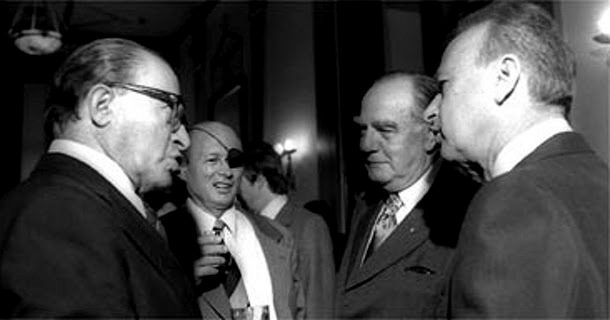 Menachin Begin, Moshe Dayan and Yitzhak Rabin with visiting South African Prime Minister, BJ Vorster (third from the left) in Jerusalem in 1976.