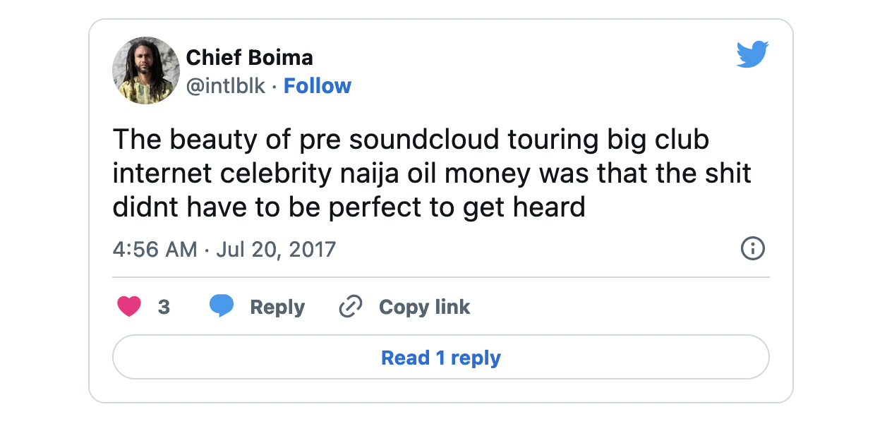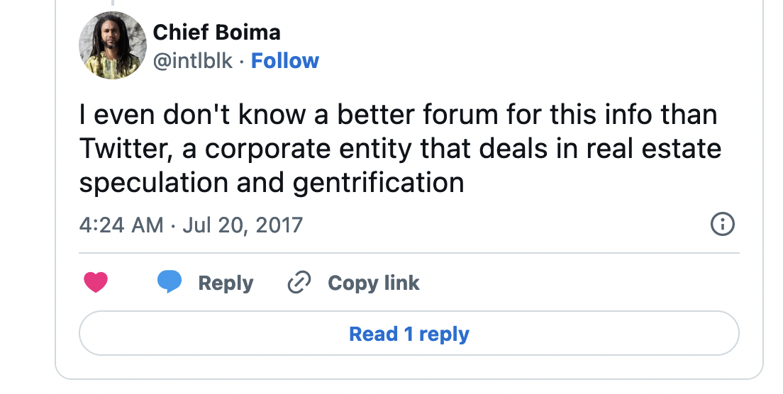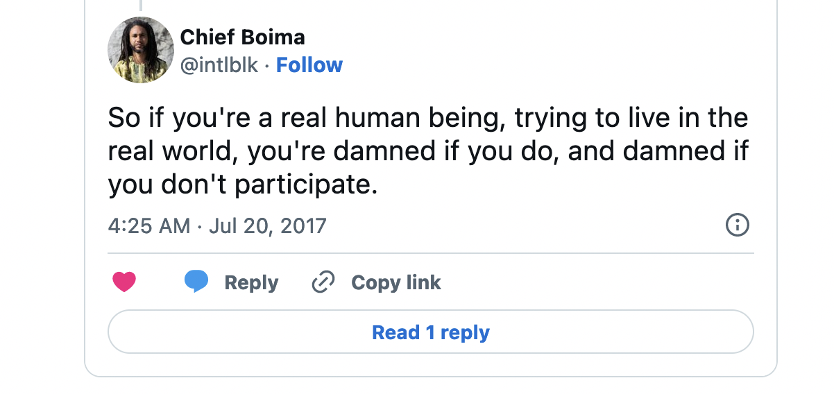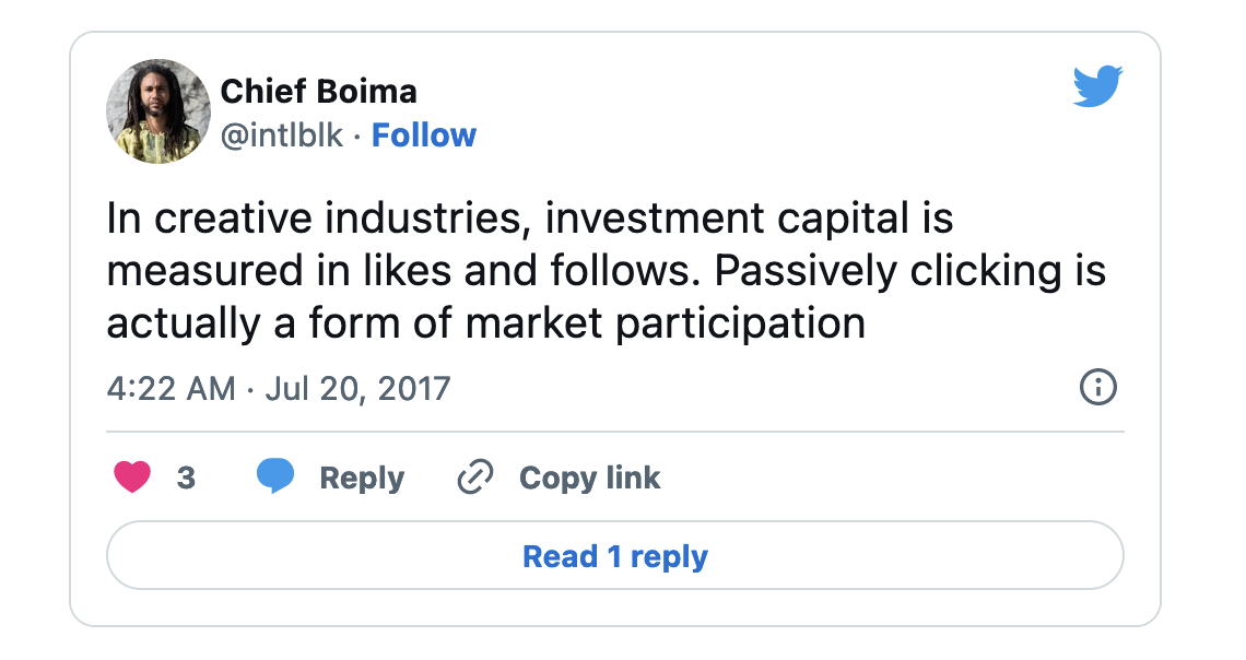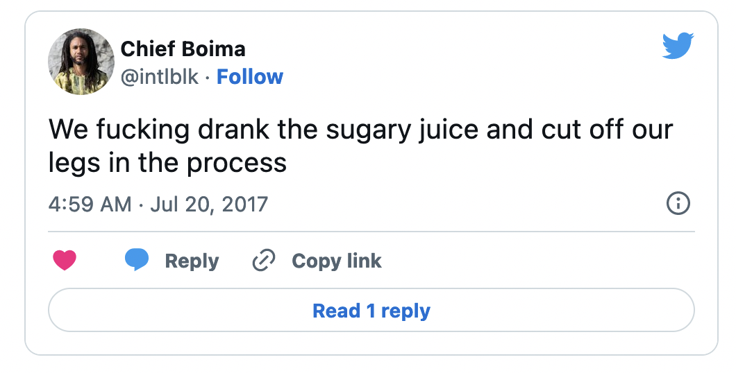 Contrary to the utopian dreams of the early internet, the idea of a more democratic communications space has given way to a system of capitalist exploitation. Anything that challenges the core of the system we create in is forced to eek out an existence on the margins, that is until it gains a million likes on Youtube and Drake remixes it. And even if an entire community gets “put on,” ultimately all they want is the polished, likable, followable, palatable (sugary drink), exclusive-able content that will get these companies their virtual social capital, which only they can convert into cold hard cash.
