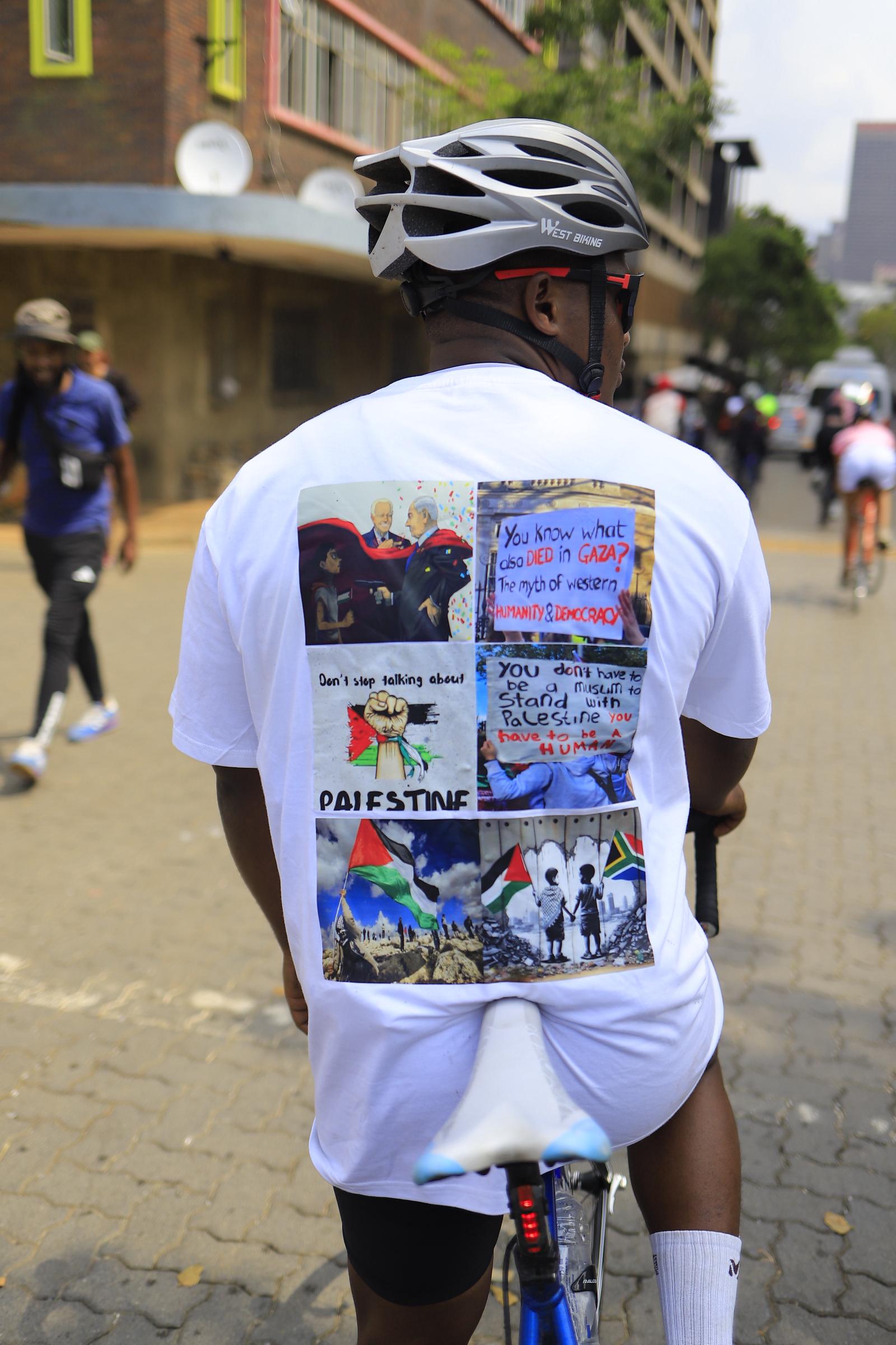 Although this ride has taken place in cities around the world, Street Friends was the first to host it on the African continent. Bikers attached Palestinian flags to their bikes and draped them around their shoulders. Sound filled the streets as bikers chanted “Free, Free Palestine,” and blasted the music of local artists like iPhupho L’ka Biko and The Brother Moves On. Cars honked in support, and people in queues for ATMs, noticing the flags, began chanting, unprompted: “From the River to the Sea, Palestine will be Free.” Bikers stopped at landmarks like Mandela Bridge and Gandhi Square, raising flags, chanting, and taking photos. As if to say: we are here.