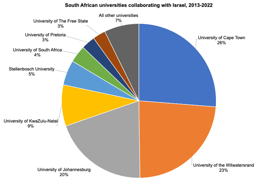 It is important to highlight that UCT and Wits have produced more co-authored scholarly publications with institutions from apartheid Israel than any African country over the past decade. These same institutions are geographically located on the African continent and like to claim to be the “gateway to the continent” (in the case of UCT), or speak about the importance of collaboration with the African continent (in the case of Wits).