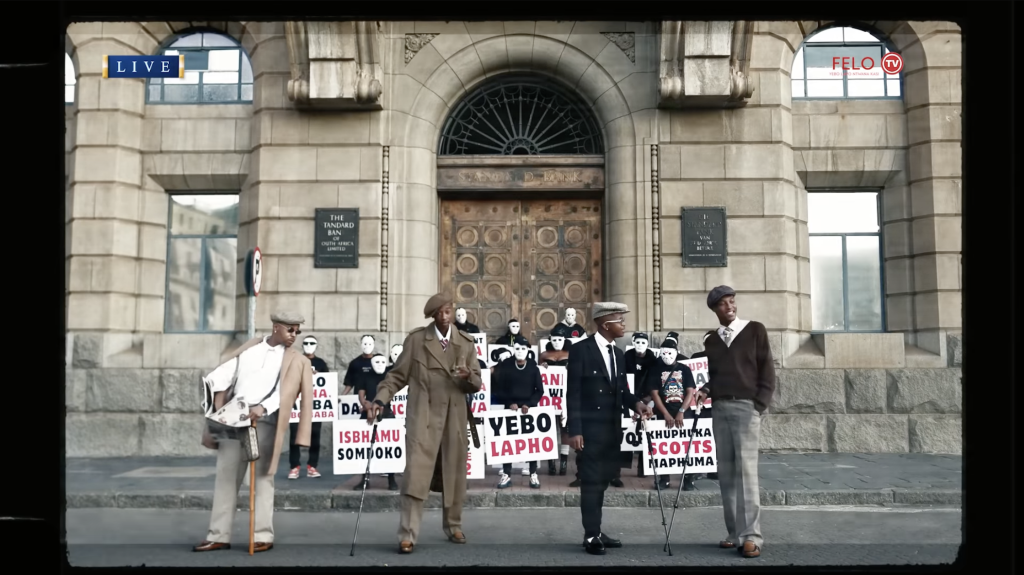 In another scene, the entourage revives Sophiatown sophistication, donning tailored coats paired with the trademark flat cap. Rooted in the 1950s tradition of cultural resistance that reimagined the Victorian aesthetic with township flair, here Scotts delivers a defiant speech. Flanked by protesters, the scene largely unfolds before a colonial-style building. Serving as broader commentary, this makes a powerful metaphorical statement. The scene’s protest elements seamlessly merge the essence of the style—expression, resistance, defiance—to the era from which it emerged. Beyond its historically inspired styling, it reclaims the very narrative that shaped this mode of dress. Here are Black men, blending creativity, ambition, and rebellion in their quest for recognition, standing on the other side of the defiance that challenged the oppressive conditions.