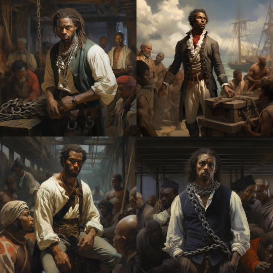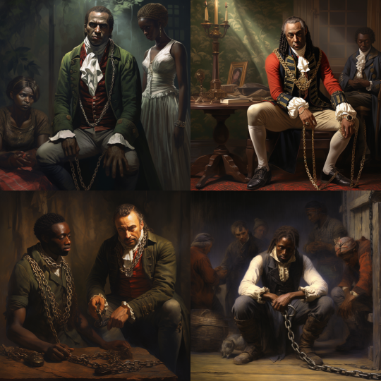 Further probing for generative biases, we decided to explore the visual representation of a British slave empire that went hand-in-hand with British colonial expansion. We ran 100 repeated prompts for “British slave trader” and, disturbingly, 96 of 100 images showed Black people—predominantly men—as supposed British slave traders, maintaining a powerfully neoliberal “CEO” pose, with chains depicted simultaneously as jewelry and means of oppression.