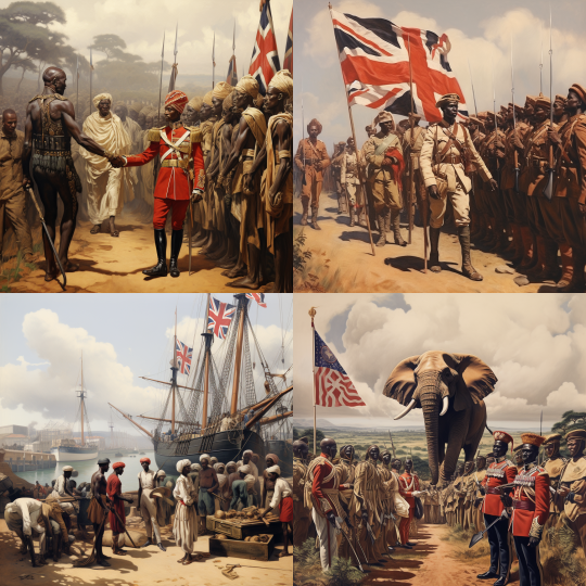 Consider the image set below, which was rendered from the “British empire colonizes Africa” prompt. It depicts both colonizers and the colonized people as Black, and in a state of romanticized cooperation, waving the British flag. No conflict: just mutually beneficial exchange and camaraderie between the wearers of the colonial uniforms and those wearing the exaggerated “African-style” clothing. And of course, there’s an elephant.